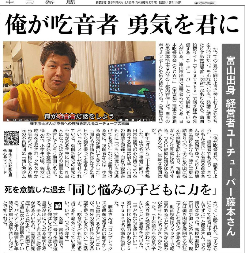 NET NEWSネットニュース 中日新聞 2021年6月21日 吃音の子 自信と希望を当事者ら 米映画無料上映へ奔走 中日新聞 2021年6月26日 吃音、ありのままで米映画上映へ当事者ら奔走「理解広めたい」 中日新聞 2021年7月21日 俺が吃音者 勇気を君に富山出身経営者ユーチューバー 藤本さん