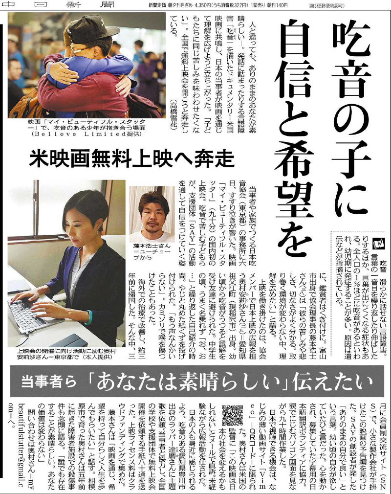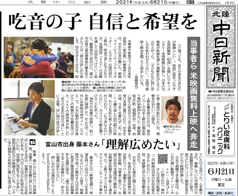 NET NEWSネットニュース 中日新聞 2021年6月21日 吃音の子 自信と希望を当事者ら 米映画無料上映へ奔走 中日新聞 2021年6月26日 吃音、ありのままで米映画上映へ当事者ら奔走「理解広めたい」 中日新聞 2021年7月21日 俺が吃音者 勇気を君に富山出身経営者ユーチューバー 藤本さん